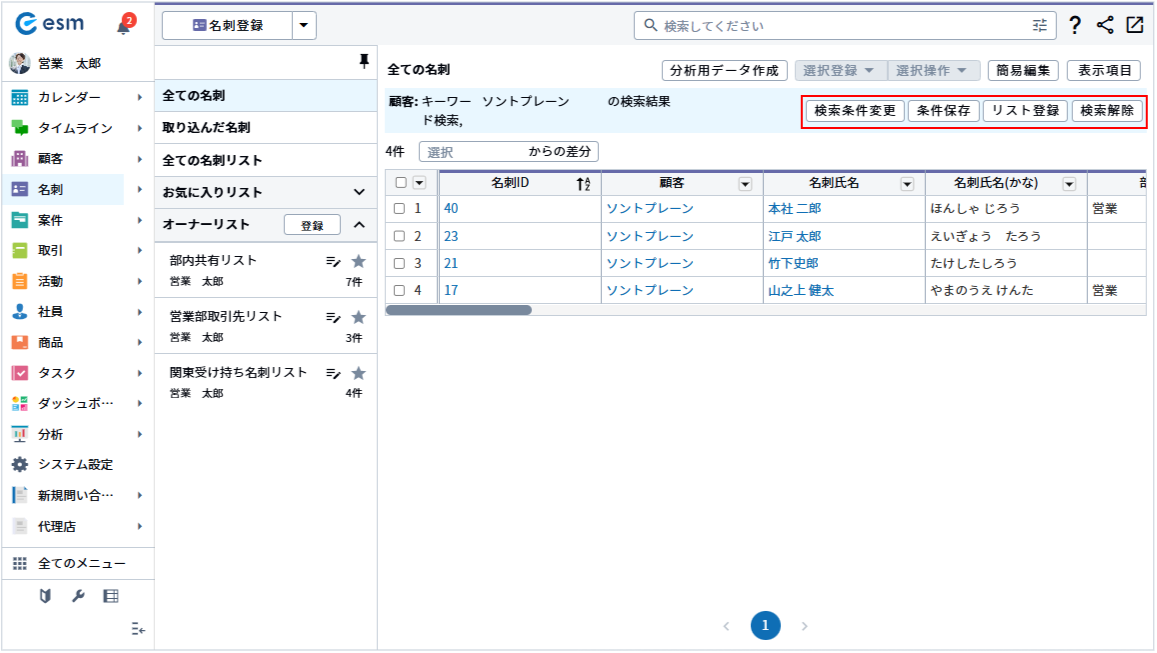 補足顧客名以外にも[顧客名(かな/その他呼称)]、[親顧客名]、[名刺氏名]、[名刺氏名(かな)]、[役職名]、[部署名]、[メールアドレス]も検索可能です。