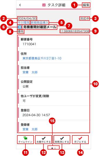 | (4) | 顧客名 | タスクに設定されている顧客名が表示されます。 タップで[顧客詳細]画面へ遷移できます。 |