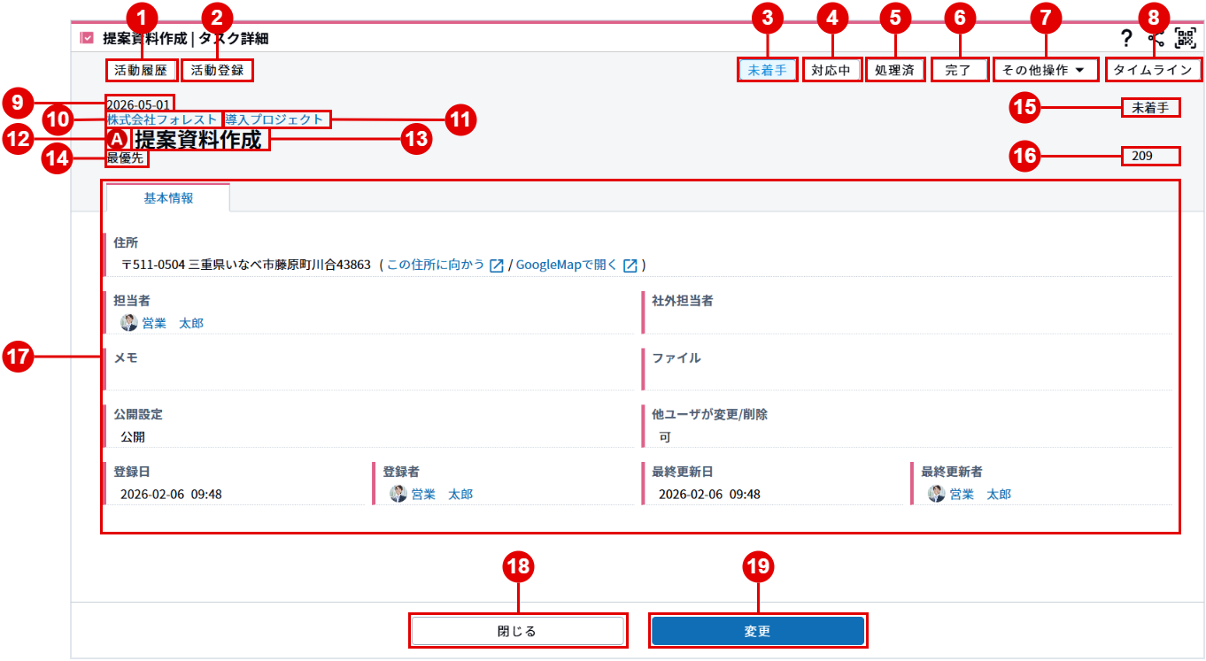 | (18) | [閉じる]ボタン | [タスク詳細]画面を閉じます。 |