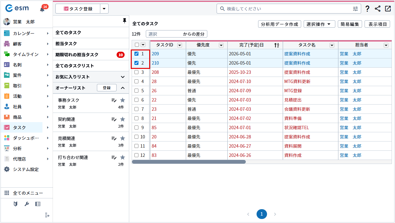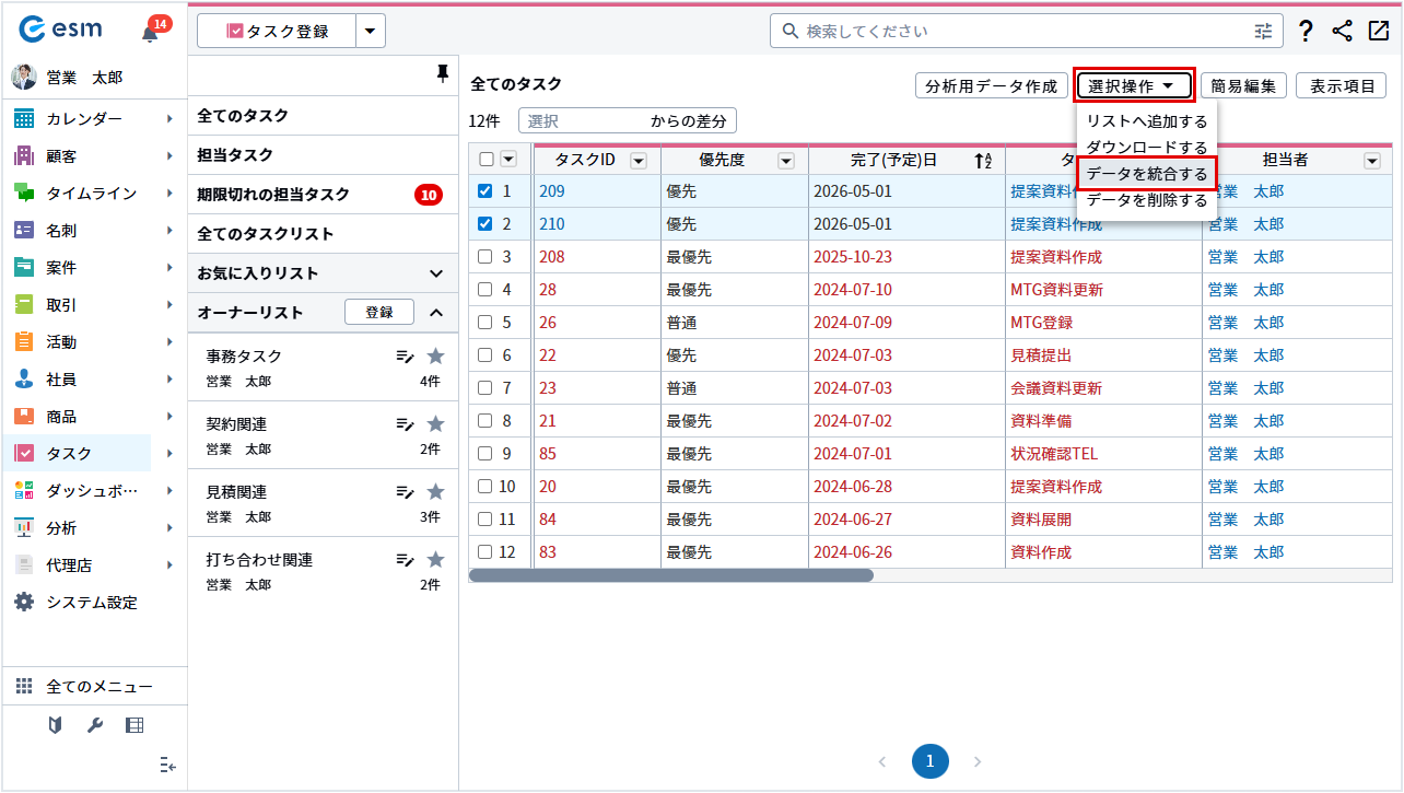 誤ってタスクを重複して登録した場合、こちらの操作でタスクおよび関連情報を統合できます。