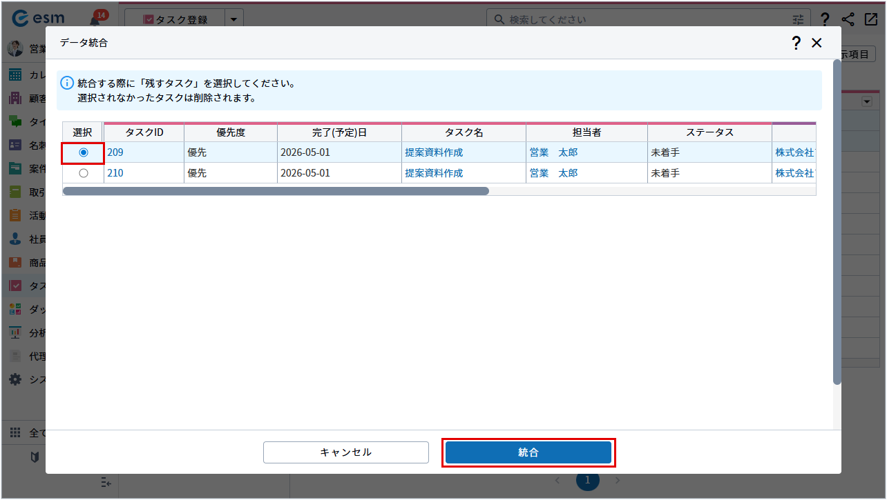 統合先タスクを選択し、[統合]ボタンをクリックします。