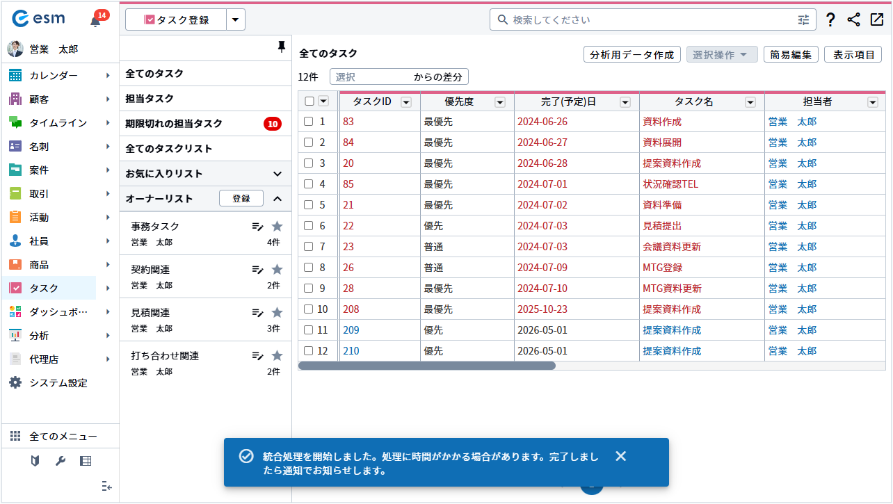 ・統合元のタスクがタスクリストに含まれている場合はリストから削除され、統合先のタスクがリストに追加されます。