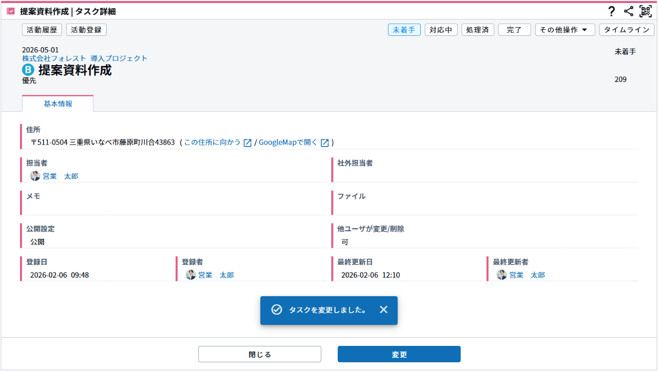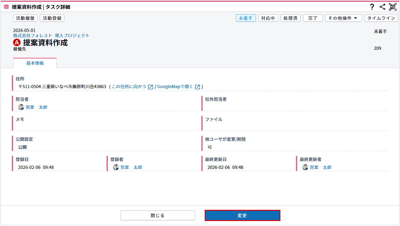 [タスク詳細]画面で、[変更]ボタンをクリックします。