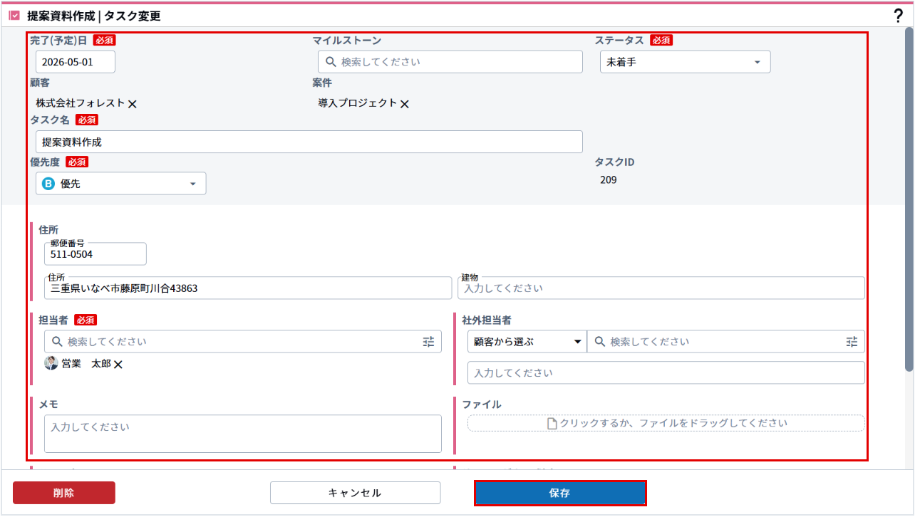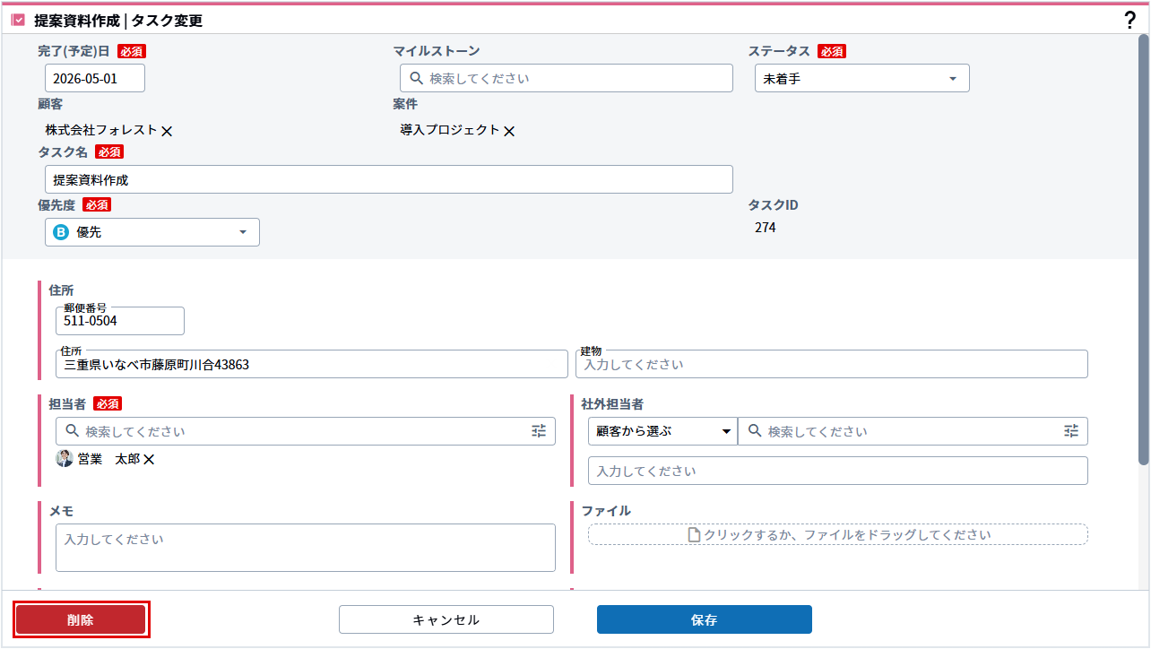 [タスク変更]画面で、[削除]ボタンをクリックします。