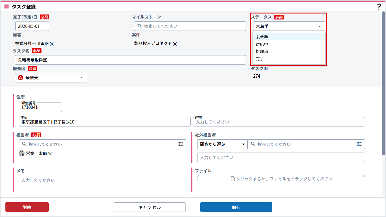[タスク変更]画面で、ステータスをプルダウンから選択します。