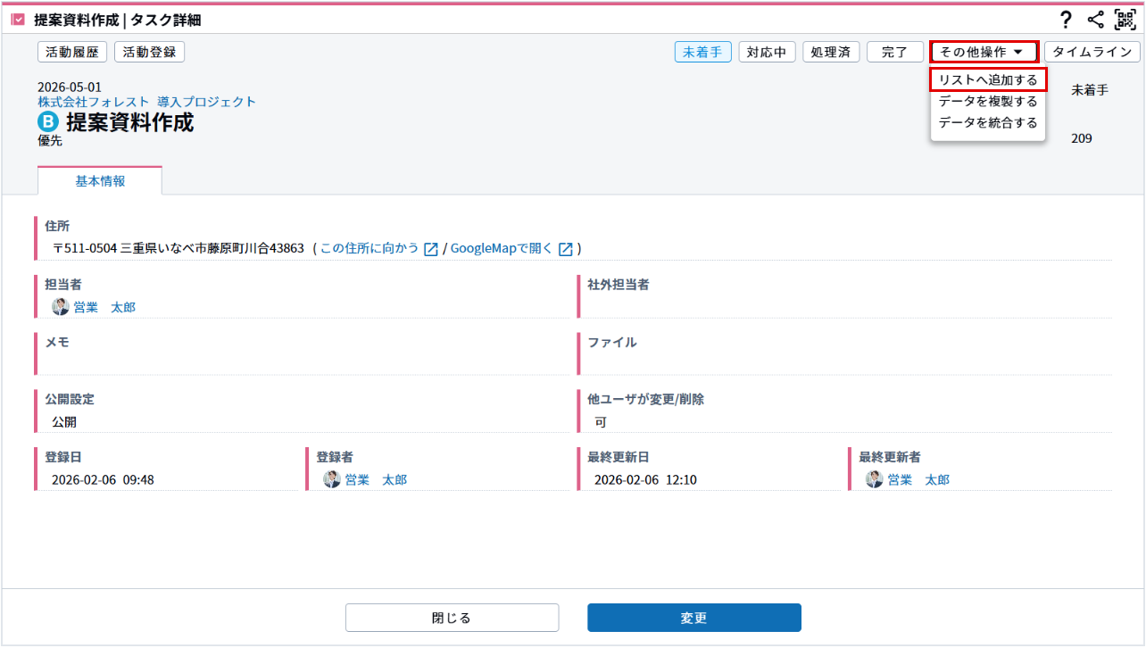・追加対象の[タスク詳細]画面より、[その他操作]の[リストへ追加する]ボタンをクリックして追加もできます。