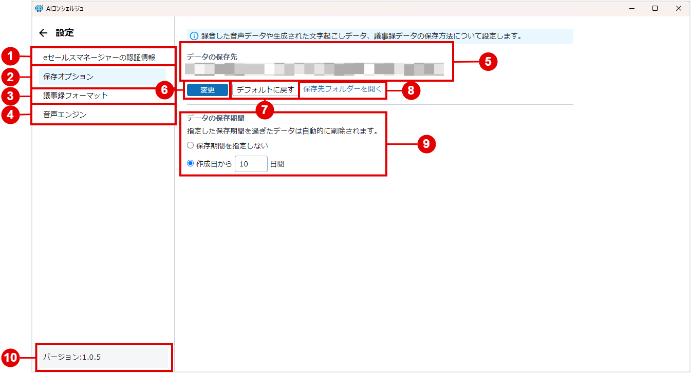 | 2 | [保存オプション] | データの保存先・保存期間の設定画面が表示されます。 AIコンシェルジュアプリで録音・文字起こしした情報などの保存先や保存期間を設定することが可能です。 |