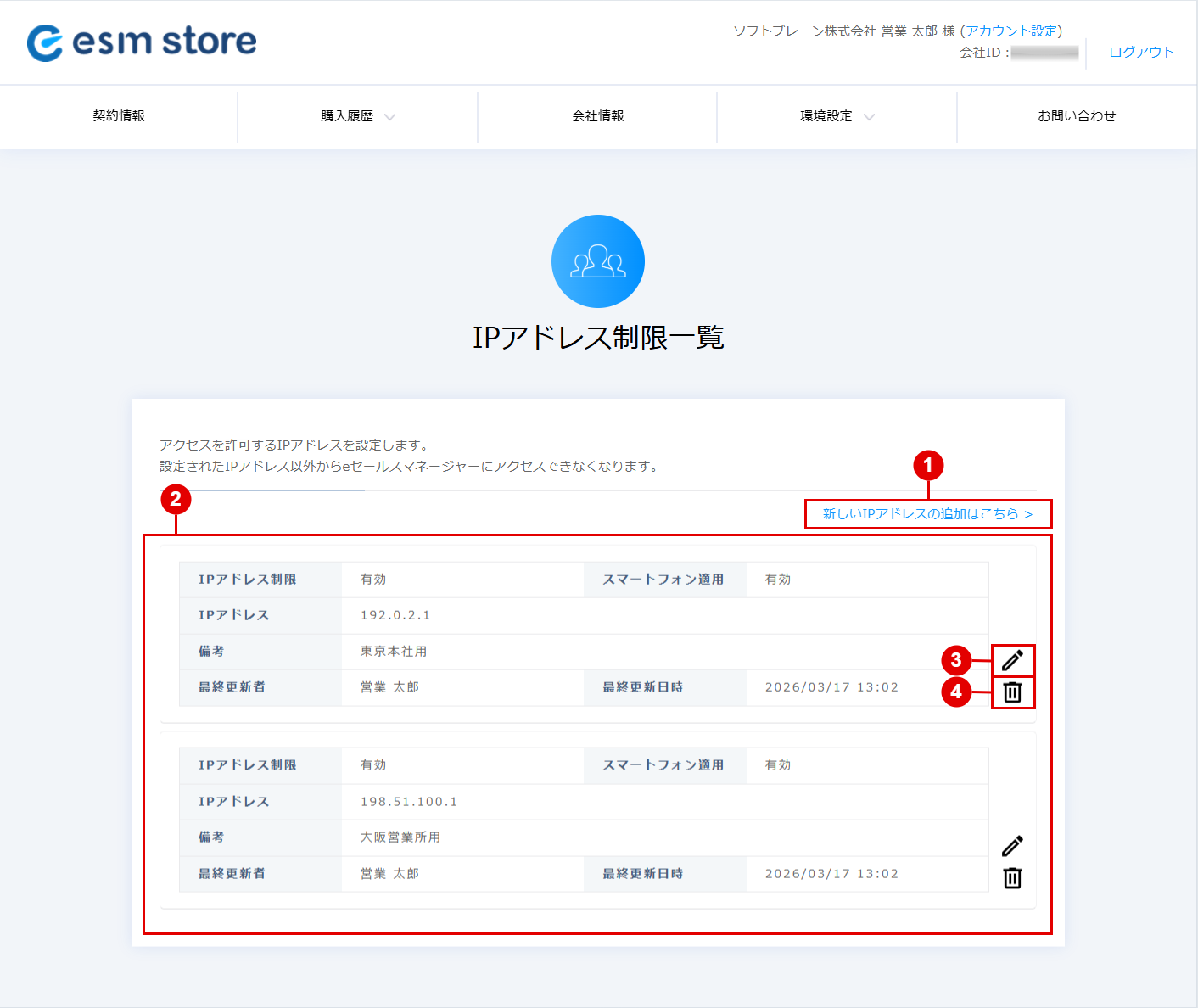 | 2 | [IPアドレス制限一覧] | 登録済みのIPアドレス制限の各項目が一覧で表示されます。 |