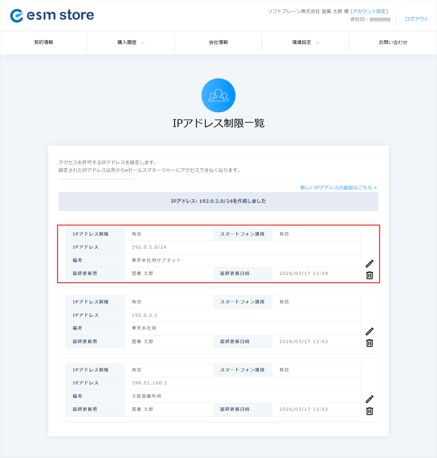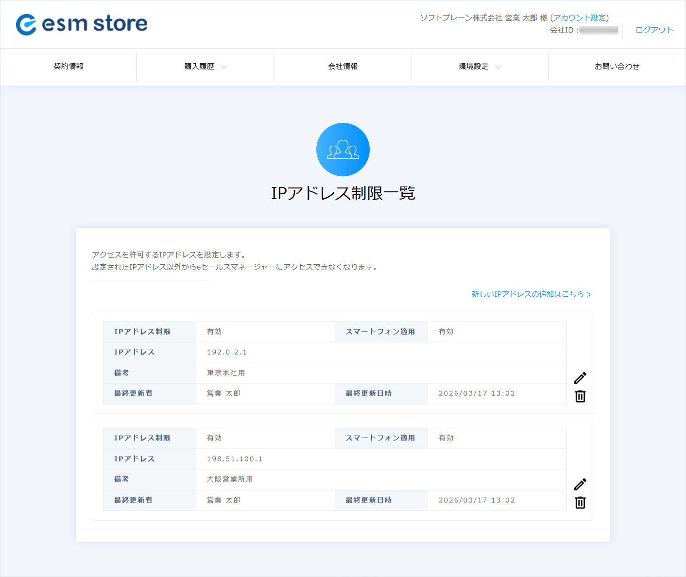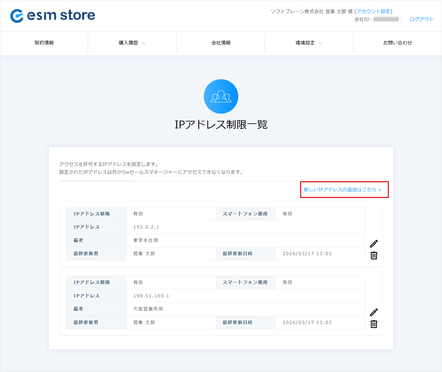・Enterpriseプランをご契約のお客様は、eセールスマネージャーストアにログイン後、IPアドレス制限一覧画面が表示されます。