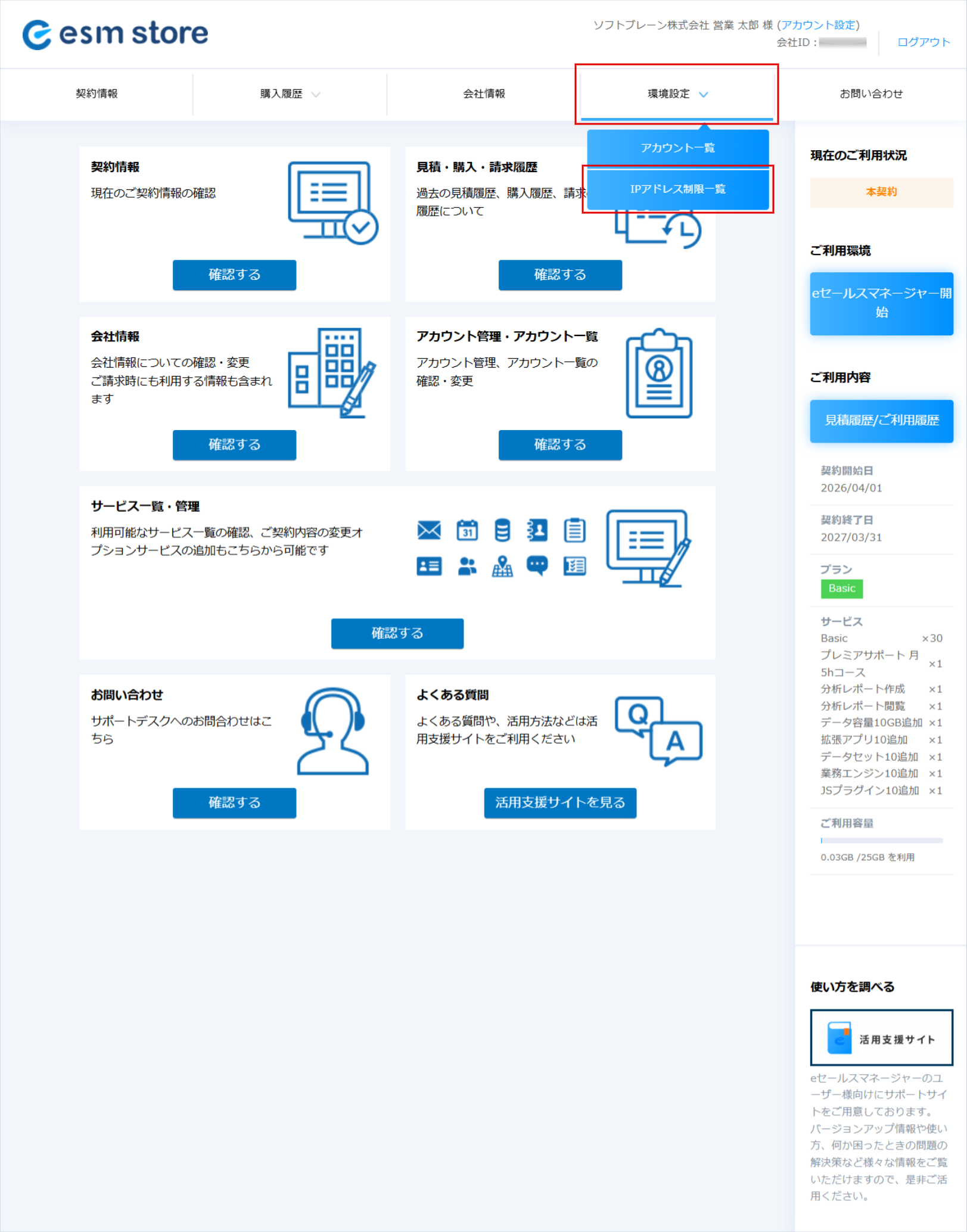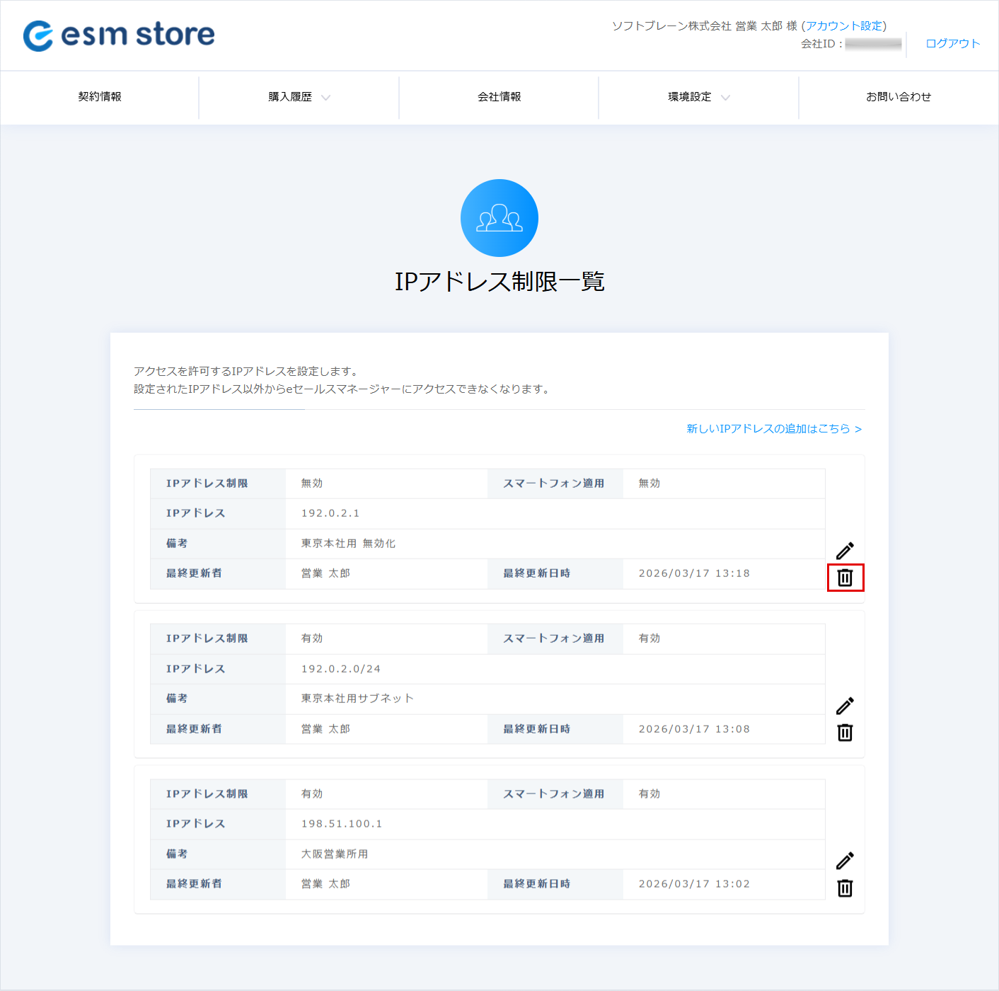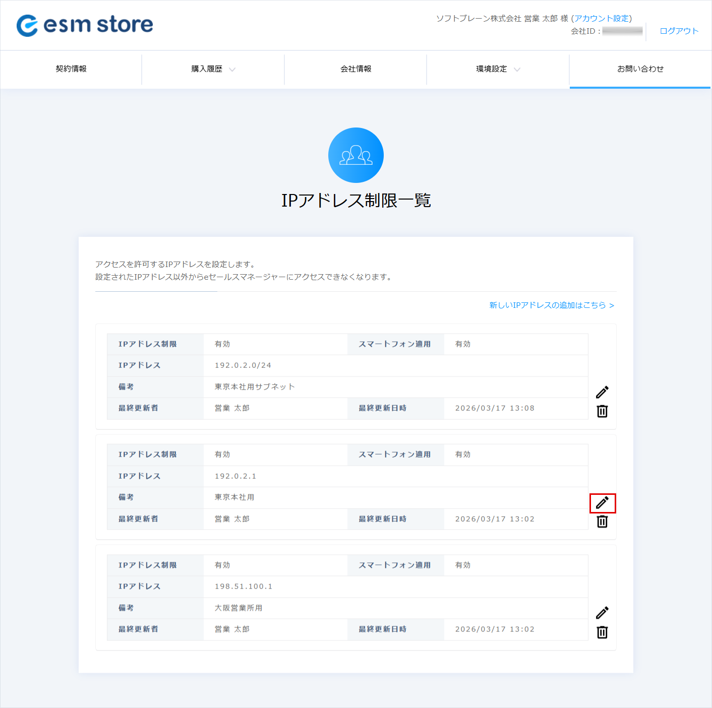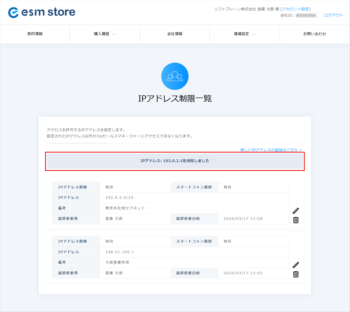 ・Enterpriseプランをご契約のお客様は、eセールスマネージャーストアにログイン後、IPアドレス制限一覧画面が表示されます。