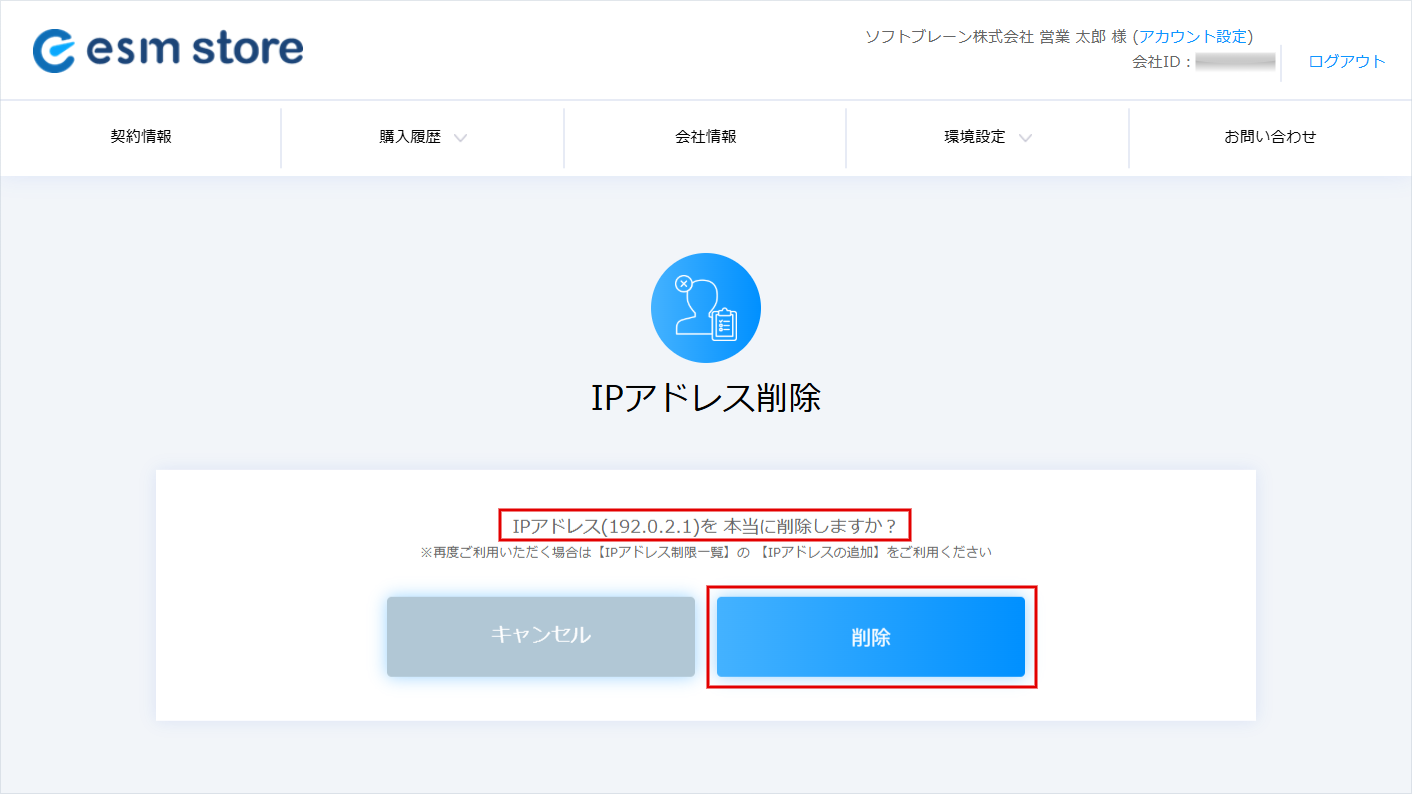削除対象のIPアドレスを確認し、[削除]ボタンをクリックします。