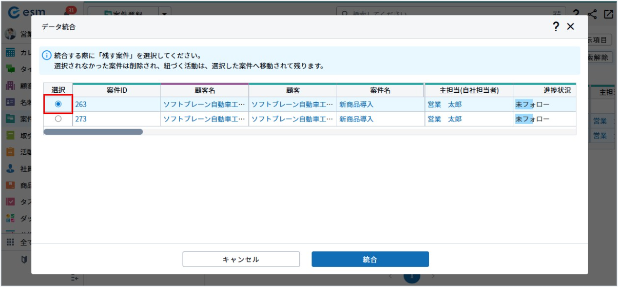 ・案件の統合を行う際、2つの案件の内、「残す案件」を選択します。
