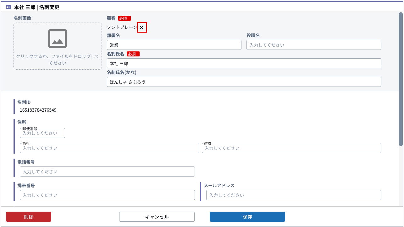 [名刺変更]画面より、[顧客]の[×]ボタンをクリックして、変更後の顧客を設定してください。